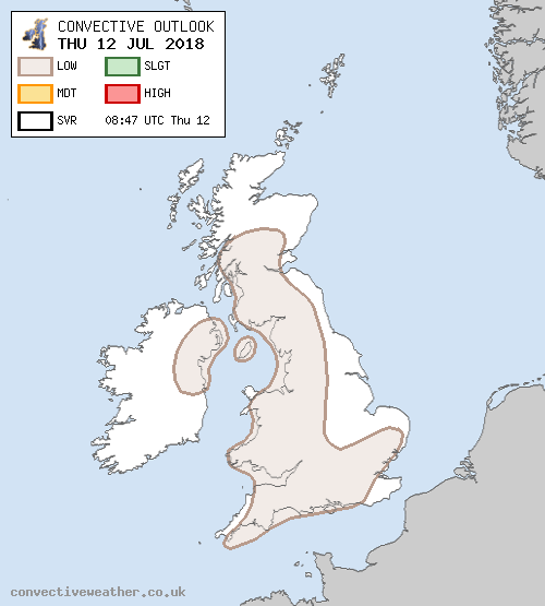 UPDATE 08:47 UTC No changes to the forecast for now - 00z observed and forecast soundings continue to suggest skinny CAPE which may be limited in height somewhat, and as such lightning may be rather sporadic / isolated - best potential over Wales where an upgrade to SLGT may still be possible. Given notable low-level convergence and favourable low-level wind fields, combined with low cloud bases, there could be several reports of funnel clouds today