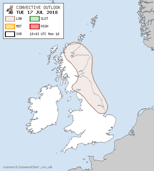 Upper trough axis will swing eastwards across the British Isles on Tuesday, clearing to the North Sea by evening. The associated cool mid-levels atop diurnally-heated land will help generate a few hundred J/kg CAPE. A few scattered showers are likely, with deep enough convection in E / NE England and E Scotland for a few sporadic lightning strikes. Main inhibiting factor is a slightly warmer nose at 700mb, which may limit the depth of convective cloud perhaps.
