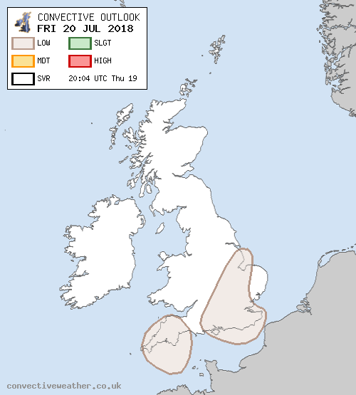 Farther north, any isolated lightning from medium-level instability release over Ireland will likely ease fairly quickly on Friday morning as instability weakens - as such, no threat levels have been issued (see forecast for Thursday for more information). A LOW threat level also issued for SW England for Friday night / early hours of Saturday with some subtle hints of marginal mid-level instability release with an area of showery rain sinking S/SE-wards.