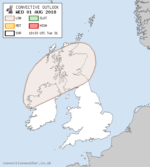 Some minor forcing aloft, associated with a dry intrusion in the mid/upper levels, may encourage mid-level instability release embedded within more generic frontal precipitation as a series of fronts move northeastwards across Scotland, Northern Ireland and NW Republic of Ireland - especially later in the day. Lightning potential is considered rather low given the lack of any notable instability and rather saturated profiles.
