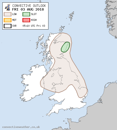 An embedded shortwave within the strong upper flow across the British Isles will track across northern England / southern Scotland on Friday morning, inducing a wave along the trailing cold front. This forced ascent may result in mid-level instability release, with the chance for some sporadic lightning - perhaps most likely near the coast of NE England and then points offshore. Some reasonable speed shear will exist to enable cells to become somewhat organised. Confidence on lightning coverage is not particularly high, so will refrain from issuing a SLGT for now.
