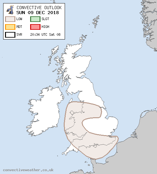 Main interest during this forecast period will be on Sunday morning as the upper trough axis, initially over southern Britain, clears to the southeast. Showers will be numerous across England and Wales at first, but becoming increasingly restricted to Wales / Cheshire Gap Effect as upper forcing weakens in the wake of the departing upper trough. Therefore the greatest risk of lightning, albeit still quite low, will be between 06z - 10z. Showers will occur elsewhere, but with a very low risk of lightning.