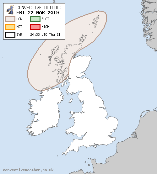A cold front will slide southeastwards across Ireland and Scotland on Friday, weakening significantly by the time it reaches Wales and northern England during the afternoon. However, a for a time some elements of line convection seem likely given a narrow tongue of warm, moist low-level air within a strongly-sheared environment and marked wind veer as the front moves through - this perhaps most notable in Ireland.
