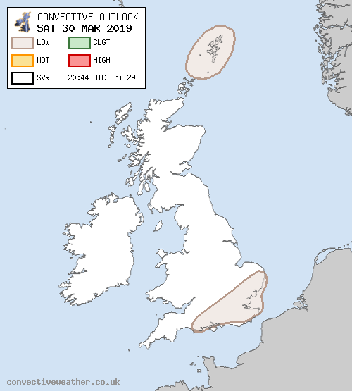 On Saturday, a surface cold front will sink slowly southwards from Northern Ireland / southern Scotland into northern England. Ahead, diurnal heating in a rather slack environment will encourage sea breeze development and hence zones of low-level convergence inland, while profiles moisten aloft. This, combined with marginal moisture pooling along these convergence boundaries (dewpoints 7-10C) may provide sufficient lift for a few isolated to well-scattered showers to develop on Saturday afternoon and early evening. Lack of any notable shear and rather weak instability suggests lightning is rather unlikely, and so should be treated at the lower end of our LOW threat criteria (5%).