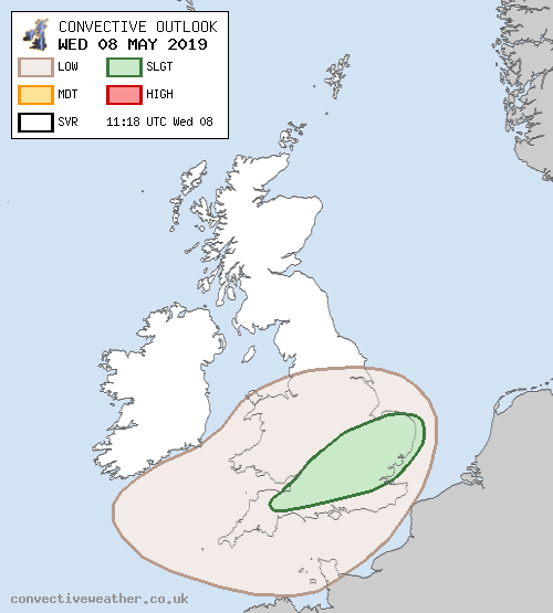Some uncertainty exists over the potential for more cloud and showery outbreaks of rain that could develop over SW England during the afternoon hours, associated with an area of low pressure running eastwards nearby (over the western English Channel). NWP guidance differs in its handling of this feature, and if this cloud/rain does push into SW England (and further east later in the afternoon) then this may reduce the overall thunderstorm potential, especially in the southern portion of the SLGT. Meanwhile the far north of the SLGT area (i.e. Lincolnshire) is subject to slow cloud clearance following morning rain - some model guidance restricts instability to The Wash southwards.