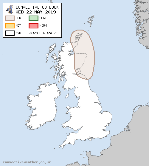 One or two isolated lightning strikes may occur over eastern Scotland on Wednesday afternoon as areas of showery rain move offshore in an environment of a few hundred J/kg CAPE and reasonably steep mid-level lapse rates.
