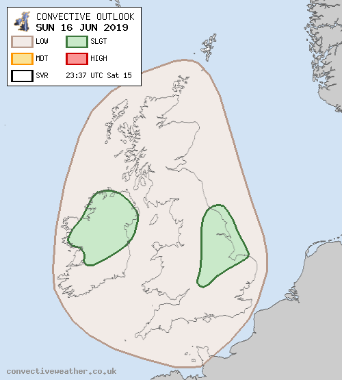 An increasingly elongated upper low will reside to the west of Ireland, creating strong southwest flow aloft over the British Isles. Cool air aloft combined with diurnal heating of a reasonably moist low-level airmass (dewpoints 10-13C) will yield 300-700 J/kg CAPE. Scattered showers and a few thunderstorms are expected to develop by midday and through the afternoon / early evening, particularly across N / NE Scotland, the Midlands into northern / eastern England, and across the Republic of Ireland and into Northern Ireland.