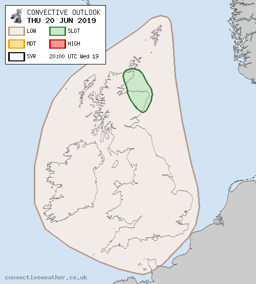 Forecast profiles are generally capped around 600mb, despite a reasonably-sheared environment (though the best shear may be above the equilibrium levels). Deeper convection is more likely across northern Britain, especially eastern Scotland, where the greatest instability is also expected. While the odd isolated lightning strike is possible almost anywhere, it is considered most likely in northern and eastern Scotland - though even here some concerns over restricted cloud height exist (and weak shear). For now, a low-end SLGT has been issued.