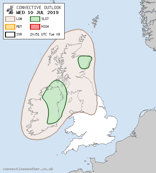 Over Scotland cloud depth may be somewhat limited, which combined with very weak shear suggests that there may not be much in the way of lightning activity, despite the potential for heavy, slow-moving "pulse type" showers. We have tentatively included a low-end SLGT to highlight the main area of interest, and it could be the case that most activity occurs quite late in the day (i.e. in the evening hours). Localised surface water flooding is the main concern given slow movement of showers.