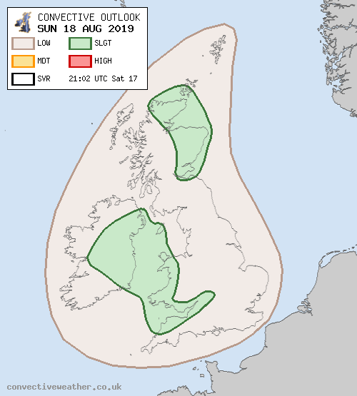 A few low-end SLGTs have been introduced for corridors where lightning potential may be somewhat greater, but it is likely some isolated lightning will occur elsewhere within the LOW threat area. The most intense cells may produce hail up to 1.5cm in diameter and gusty winds - the main area of interest for any semi-organised convection will be Sunday morning from SW England / S Wales and across the Midlands.