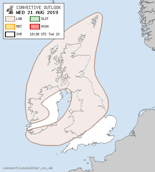 Behind the front, upper cold pool will overspread NW Scotland through Wednesday night, steepening mid-level lapse rates and generating numerous showers - although any lightning activity will probably be quite isolated.