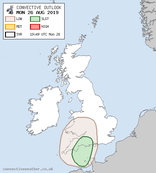 UPDATE 19:49 UTC SLGT introduced to parts of the English Channel / Dorset, Wilts etc where a few scattered elevated thunderstorms may occur late on Monday night into Tuesday morning. Uncertainty remains over timing and coverage of any lightning activity, and it is possible isolated pockets of lightning may occur elsewhere over Devon/Cornwall, but the most favoured corridor is essentially Lyme Bay