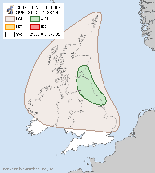 An upper trough will migrate eastwards across the British Isles and North Sea during Sunday, the associated cold pool across northern areas creating an environment with reasonably steep mid-level lapse rates and a few hundred J/kg CAPE. Areas of showery rain may be affecting parts of W / SW Scotland and NW England during the morning, but this is expected to break up into scattered showers through the day. Elsewhere, numerous showers are expected to develop, particularly in response to diurnal heating inland. A few sporadic lightning strikes are possible, especially in E / SE Scotland and NE / E England during the afternoon hours where the deepest convection is most likely to occur - and a low-end SLGT has been introduced. Hail 1.0-1.5cm in diameter may be possible from the most intense cells.