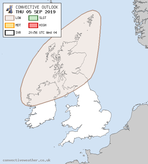 A few isolated showers will be possible on Thursday daytime, particularly feeding through the Cheshire Gap into the N + W Midlands, but in general limited convective depth and weak instability suggests the risk of lightning is very low. The next Atlantic frontal system will spread cloud and rain into Scotland and Northern Ireland on Thursday evening, sliding southeastwards through the overnight hours. Behind the cold front, cool air aloft overspreading warm SSTs will generate a couple hundred J/kg CAPE, with scattered showers then affecting Scotland and Northern Ireland which may produce a few isolated lightning strikes during the night - the risk generally greatest across northern Scotland and the Northern Isles.