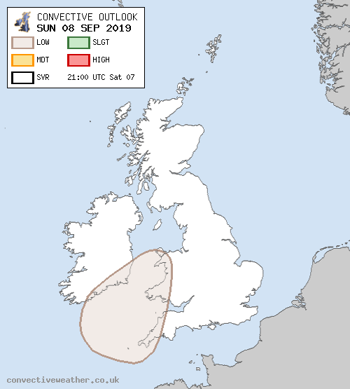 An upper ridge covers the British Isles for much of Sunday, generally preventing any notably deep convection from occurring. However, an upper low over the Low Countries will allow a sufficiently deep boundary layer for a few showers to affect primarily coastal parts of East Anglia and Kent, although the risk of lightning is considered very low.