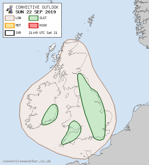 Behind the cold front, the main upper trough axis will cross Ireland and SW Britain during the afternoon hours. The associated cool air aloft atop warm seas and diurnal heating inland will encourage scattered showers to develop, some weakly-electrified. Two low-end SLGTs have been introduced to cater for this risk over SE Ireland and SW England / S Wales.
