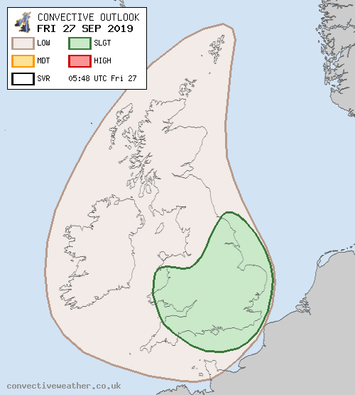 Scattered showers will already be affecting parts of Ireland and the Irish Sea first thing on Friday morning, and are expected to develop fairly widely, organised into distinct bands at times. With cool air aloft atop warm seas and diurnal heating inland, this will yield 300-600 J/kg CAPE. Shear will tend to increase from the west during the afternoon hours, which combined will help organise convection at times. Sporadic lightning, small hail and gusty winds will be possible from the most intense cells. Given relatively low cloud bases and reasonable LLS, an isolated tornado is also possible.
