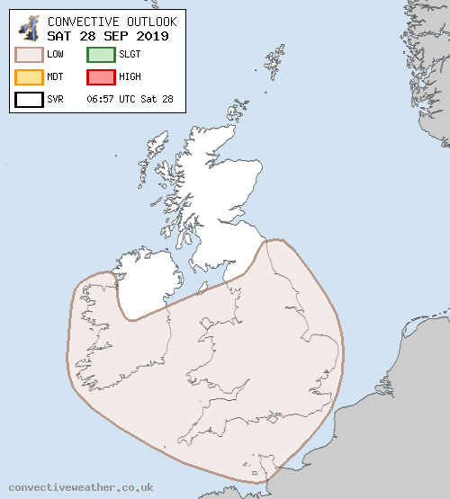 An old upper low will drift slowly eastwards from Scotland to Scandinavia during Saturday, allowing a temporary window of ridging to develop from the west - generally suppressing much in the way of deep convection and therefore the risk of lightning during Saturday daytime is considered very low.