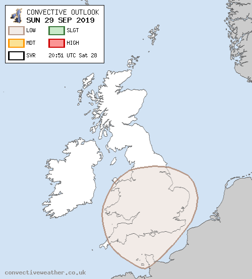 A surface low will track eastwards across England and Wales on Sunday, with a rather complex precipitation pattern as various pulses of rain, a combination of both dynamic and convective, gradually slide eastwards. Overall, instability is a little weak and so the risk of lightning is considered fairly low in any one location, but a few isolated strikes are possible.