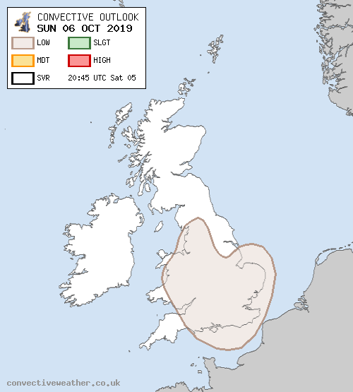 Disrupting upper trough will result in an upper low sliding quickly southeastwards across England and Wales on Sunday, reaching the Low Countries by the end of the afternoon. On the forward side, an overlap of cooling aloft combined with upper forcing and subtle surface heating on Sunday morning may encourage a few heavy showers to develop immediately to the rear of the main frontal rain - with a primary focus over CS / SE England. Should any showers develop during the morning hours then there may be a few lightning strikes.