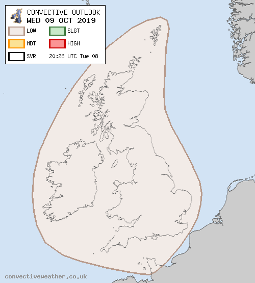 Similar to Tuesday, instability is a little marginal and convection a little restricted in depth for much in the way of lightning activity, hence the rather broad LOW threat level. Given weaker shear expected (away from the far southwest), no low-end SLGTs have been introduced since confidence of much in the way of lightning, and exactly where, is rather low. The main focus is probably the Bristol Channel and adjacent coasts, and also the eastern English Channel.