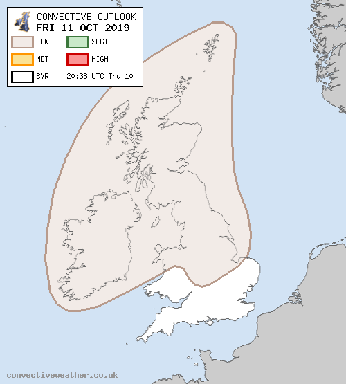 A waving cold front will move slowly southeastwards across England and Wales on Friday, with elements of line convection at times on the cold front given the strongly-sheared environment. This may produce some strong gusts of wind and brief spells of heavy rain. However, given weak instability and fairly saturated profiles, lightning is considered a very low risk.