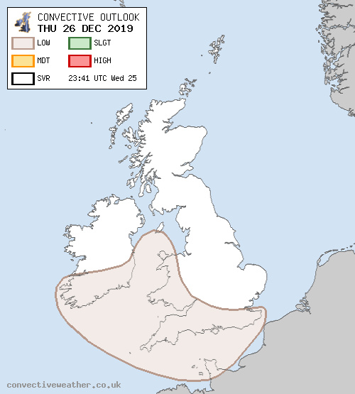 As an upper trough disrupts, with one piece drifting eastwards across southern Britain on Boxing Day, scattered showers may develop behind the main frontal rain in an environment with a couple hundred J/kg CAPE. The majority of showers will be located within the base or axis of the trough, where shear is typically weaker, and so the poor phasing of CAPE and strong shear on the rear side of the trough does not bode well for much in the way of organisation and hence lightning prospects. Given restricted cloud depth and fairly weak instability, we do not anticipate much (if any) lightning activity.