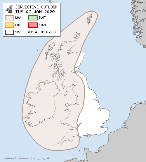 Behind a cold front, cold air aloft will overspread Scotland resulting in increasing instability (a couple hundred J/kg CAPE) and steepening lapse rates. Showers will affect many western areas, but will move well-inland courtesy of organised troughs/occlusions in the flow. A few isolated lightning strikes may be possible, but the restricted depth of convection may limit this threat somewhat. Particularly attention is given to the late afternoon / early evening hours as a trough potentially moves west-to-east across Scotland in a very strongly-sheared environment - there may be scope for a low-topped supercell.