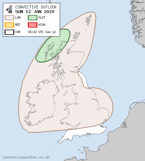 A band of intense convection near west Wales first thing on Sunday morning, associated with a shortwave embedded within the brisk southwesterly flow aloft, will weaken as it moves inland across Wales / Midlands / northern England during Sunday morning, but may still pose the risk of isolated lightning strikes. Some strong gusts of wind and an isolated tornado remain possible with this feature.