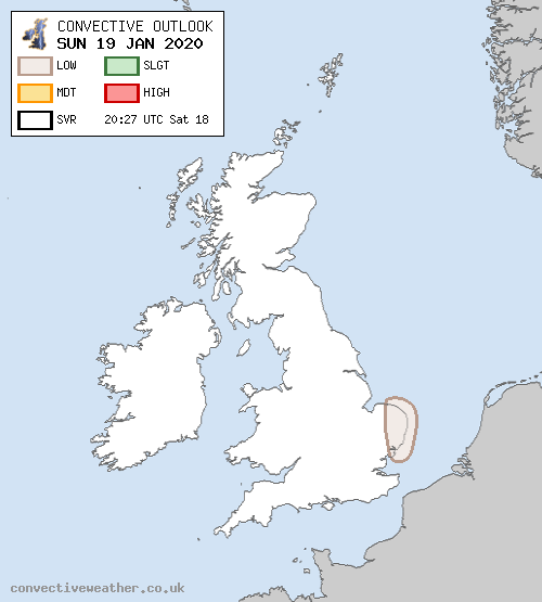 Isolated showers over East Anglia on Sunday morning have a low risk of producing the odd lightning strike - otherwise strong ridging will persist over the British Isles, limiting any deep convection.