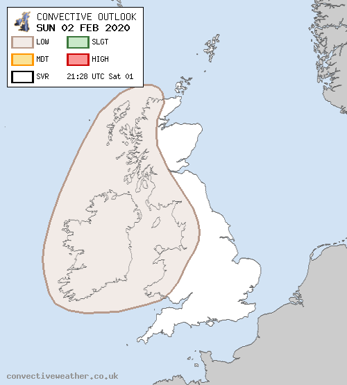 Following the main frontal band of rain (and hill snow), scattered showers will move across Ireland into western Britain on Sunday. Given a couple hundred J/kg CAPE and strong shear, a few isolated lightning strikes may be possible. Convective depth will be somewhat restricted away from NW Ireland and W Scotland, but given the wind profile there could be an opportunity for a low-topped supercell.
