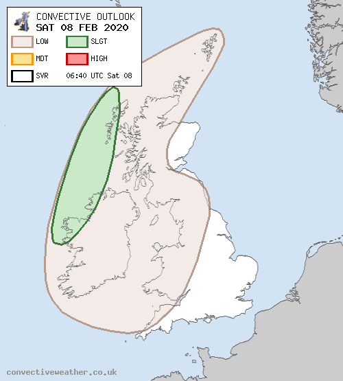 A band of squally rain is expected to develop late on Saturday morning, eventually approaching NW Ireland and W Scotland during the afternoon, perhaps producing some sporadic lightning over the Atlantic but is expected to weaken (lightning-wise) as it moves inland. As such, have tentatively introduced a low-end SLGT, but the main focus will be offshore to the west of these areas. Nonetheless, damaging gusts of 70-80mph will be possible with this feature as it moves into the Outer Hebrides in particular. CAPE will be rather weak by landfall, and profiles rather saturated despite strong shear, and so lightning activity is a little questionable.