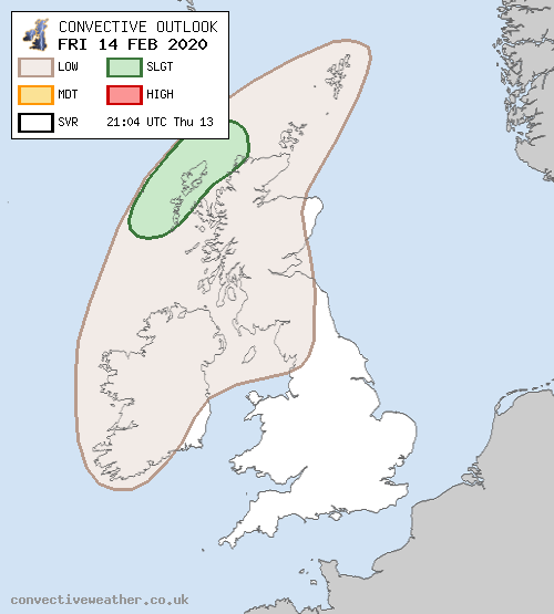 Some line convection is possible along the cold front as it tracks eastwards across Ireland on Friday morning, but this is expected to weaken with time and the lightning risk is considered very low overall. This may also be followed immediately by a post-frontal trough, also with elements of line convection. Behind the front, cool air aloft will steepen mid-level lapse rates and generate up to 600 J/kg CAPE over the Atlantic, just 100 J/kg inland over Ireland and Scotland. Nonetheless, the environment will be strongly sheared, and so scattered showers affecting these areas during Friday daytime may produce a few isolated lightning strikes. The areas at greatest risk of some sporadic lightning are the Outer Hebrides, with greater proximity to larger offshore CAPE - a low-end SLGT has been introduced, but it is likely most of any lightning activity may remain offshore to the west of these areas (peak time mid-afternoon Friday).