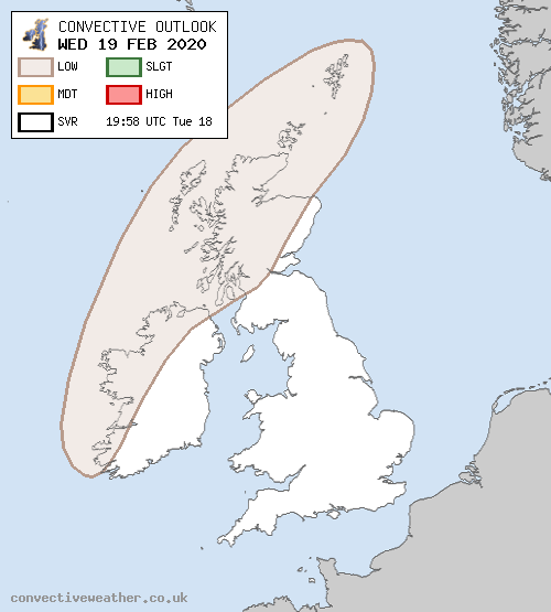 Scattered showers will affect northern Scotland on Wednesday morning, and will return to western Scotland and eventually western Ireland during Wednesday night. In both regimes, a few isolated lightning strikes will be possible. Elsewhere, some line convection is expected to evolve along the trailing cold front over Ireland, later spreading across the Irish Sea into western Britain. This feature is likely to be fairly shallow, and given saturated profiles and weak instability the risk of lightning is considered very low.