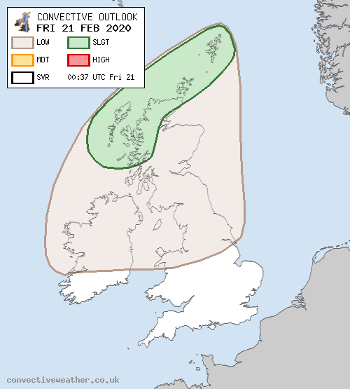Frontal rain will affect Northern Ireland, southern Scotland, northern England and north Wales through much of Friday daytime. North of this, showers will spread across the Hebrides, Northern Isles and northern Scottish mainland. Despite marginal CAPE, the strongly-sheared environment could encourage a few isolated lightning strikes to occur. Overnight, the main frontal rain will sink southwards, allowing more of northern Britain to be affected by deep convection with showers becoming widespread, driven by strong westerly winds. Hail is likely in many of the showers (along with snow in places), and sporadic lightning will likely become more widespread across northern and western Scotland as mid-level lapse rates continue to steepen, and CAPE increases. A low-end SLGT has been issued, with the main interest during Friday night.