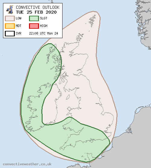 Another shortwave will enhance shower activity towards NW Ireland on Tuesday evening, eventually approaching western Scotland during the early hours of Wednesday. Away from these more organised features, random scattered showers will still occur capable of producing a few isolated lightning strikes - particularly over NW England. Strong, gusty winds will be possible with the most intense showers - particularly in southern and western Ireland towards SW England, and it is in these areas that an isolated tornado may also be possible. Eastern Scotland and NE England will see very few showers, and could stay largely dry.