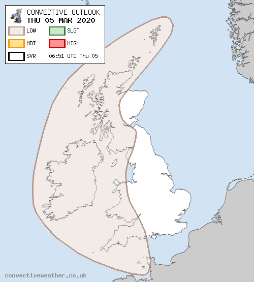 Showers will affect parts of Ireland, northern and western Scotland during Thursday daytime, others also developing inland in response to diurnal heating. However, marginal instability and limited convective depth suggests any lightning will be isolated. Some deeper convection may develop over the Brest peninsula, close to the centre of a deepening cyclone over northern France. This brings a slightly higher risk of lightning close to the Channel Islands around late morning/early afternoon, before clearing to the east - most activity will probably stay to the south in either case.