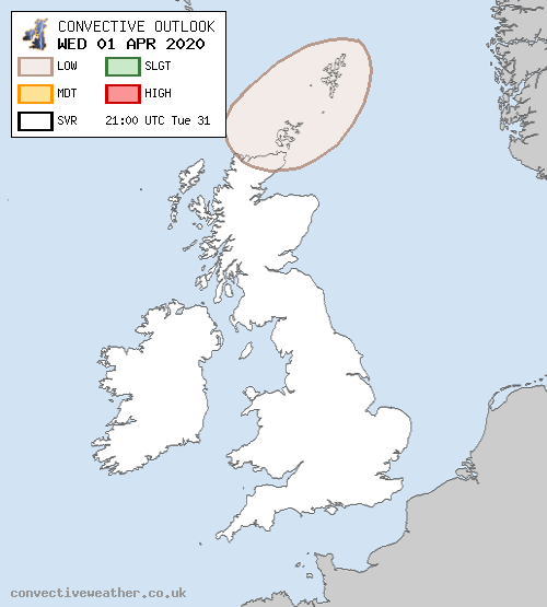 On Wednesday night, increasingly cold air aloft in a highly-sheared environment will yield deep convection across the Northern Isles and environs. As such, a few sporadic lightning strikes will be possible, especially during the early hours of Thursday.