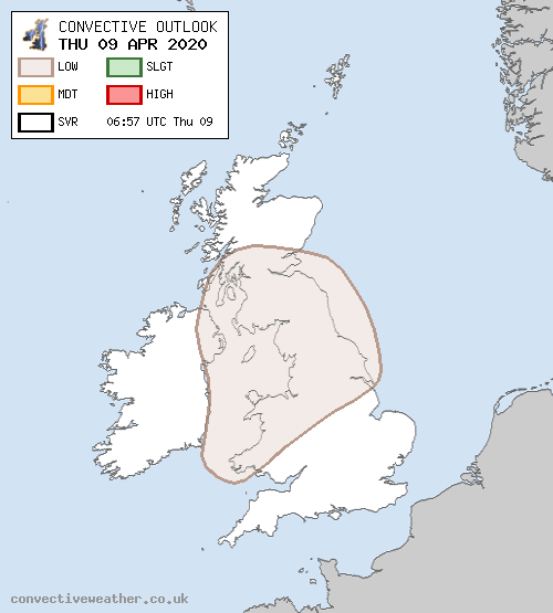 An upper ridge will build across the British Isles during Thursday, generally suppressing much in the way of deep convection. However, as the upper high centre drifts southeastwards across northern France on Thursday night, falling heights and slight cooling aloft combined with warm advection in the lower-levels will lead to some weak elevated instability developing over the Irish Sea / northern England area. Gradual moistening of the profile, especially late in the night, may result in some showery bursts of rain developing from high bases in the LOW threat area during the early hours of Friday. The risk of lightning is considered fairly low, but non-zero.