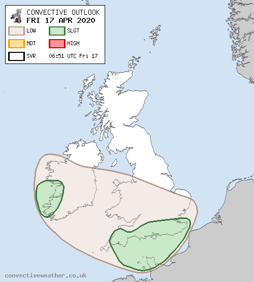 Largely dynamic (frontal) rain will already be affecting the English Channel and southern counties of England at the beginning of this forecast period on Friday morning, largely driven by increased forcing aloft from an approaching shortwave. Given the presence of some (limited) mid-level instability, embedded convection is likely and a few sporadic lightning strikes possible - more especially over the English Channel / Channel Islands / northern France. A few elevated showers may even develop ahead of this main band of rain. In either case, the intensity of this feature is likely to gradually weaken during the morning as it drifts further north across southern England and south Wales. A few showers may develop over W/SW Ireland during Friday afternoon on the leading edge of the more organised band of rain, and a low-end SLGT has been introduced to cover this risk.
