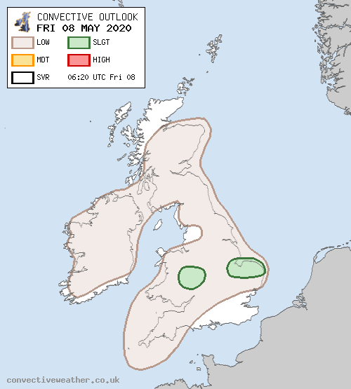 In a broad sense, an upper ridge will cover much of the British Isles during Friday, albeit heights slowly falling through the day. Weak impulses will crest the northern flank of the ridge, and may in-part aid in convective development. However, aside from Friday morning where some elevated convection may be occurring over Devon and Cornwall (with an attendant risk of lightning, albeit fairly low), the more significant factor for forced ascent will be a combination of diurnal heating, low-level wind convergence and orographic forcing.