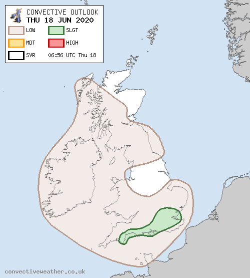 There is some considerable uncertainty as to the extent of shower/lightning activity, depending on how much cloud shield (and precipitation) lingers from the morning rain. Forecast profiles also exhibit rather skinny CAPE, and this may limit both the depth of convection and the potential for lightning - and so, even if showers do develop, lightning could be rather isolated. The greatest risk of lightning is generally considered London and the Home Counties, but even here there may not be much activity. A low-end SLGT (25-30%) has been issued, but the risk of lightning is considered much lower than during previous days.