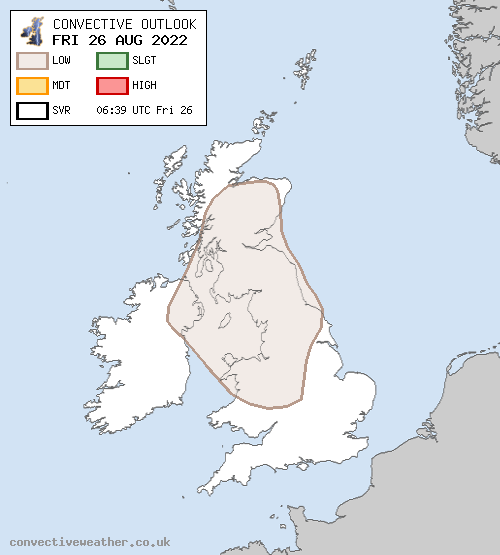 Scattered showers and patchy, showery rain will affected parts of Scotland, Northern Ireland, northern England, Wales and the Midlands on Friday and Friday night. A couple hundred J/kg CAPE is possible, but the limited convective depth suggests lightning is very unlikely - the greatest risk (albeit still fairly low) across Scotland where convection will likely be deeper.